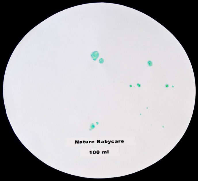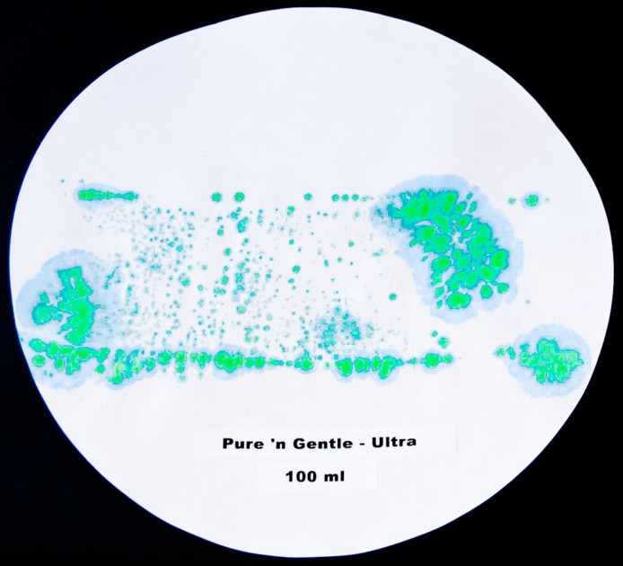The absorption test for Pure n Gentle Ultra (left), Eco by Naty (middle), and Cuties (right) are shown below. The larger green area indicates more surface moisture; less green indicates better absorption.The leak score in our tests was a 6 of 10, and that put it in the top third of the diapers we tested. Several diapers had lower scores in this metric (both cheaper and more expensive), but few had such a high leak score coupled with such a low absorption score making this diaper somewhat of an anomaly.