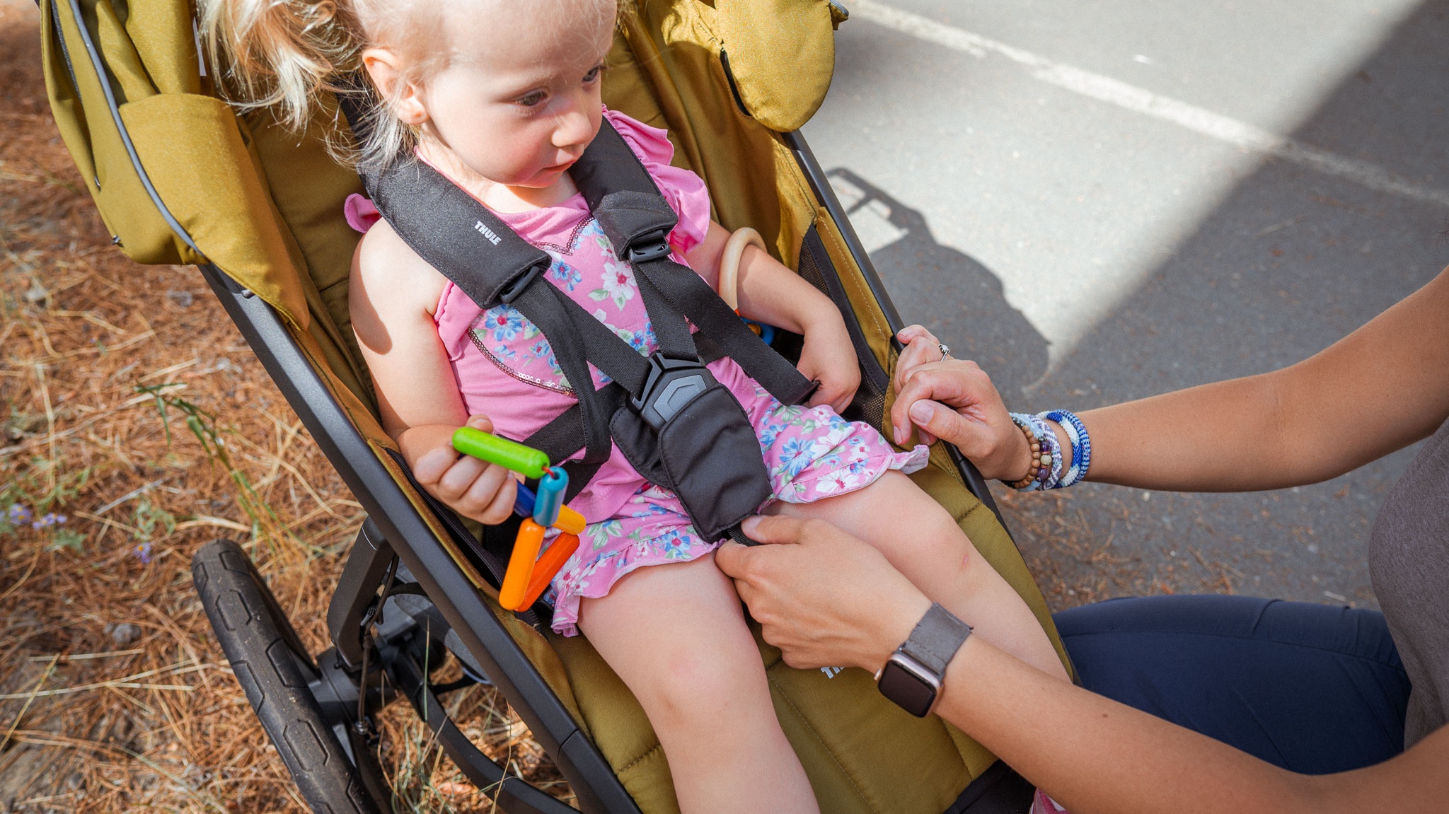 The large sling seat has an adjustable recline and a built-in leg rest. This version of the Thule has improved the all-over seat and harness padding, and little ones will appreciate the extra cushioning.