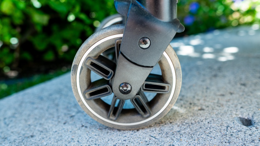 This stroller has EVA foam-filled, airless wheels, so flats and maintenance aren't a concern. The front wheels are 6.5 inches, and the rear wheels are 8.5 inches. It rolls smoothly on flat surfaces like airport terminals, hotels, or paved paths, and easily handles turns.